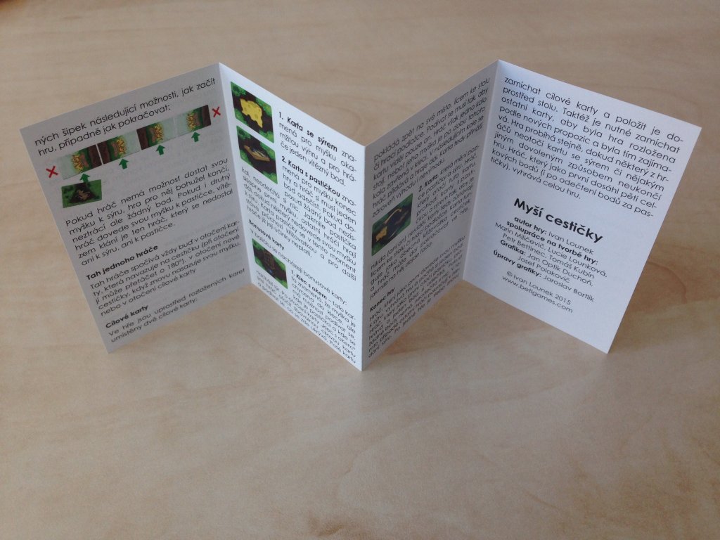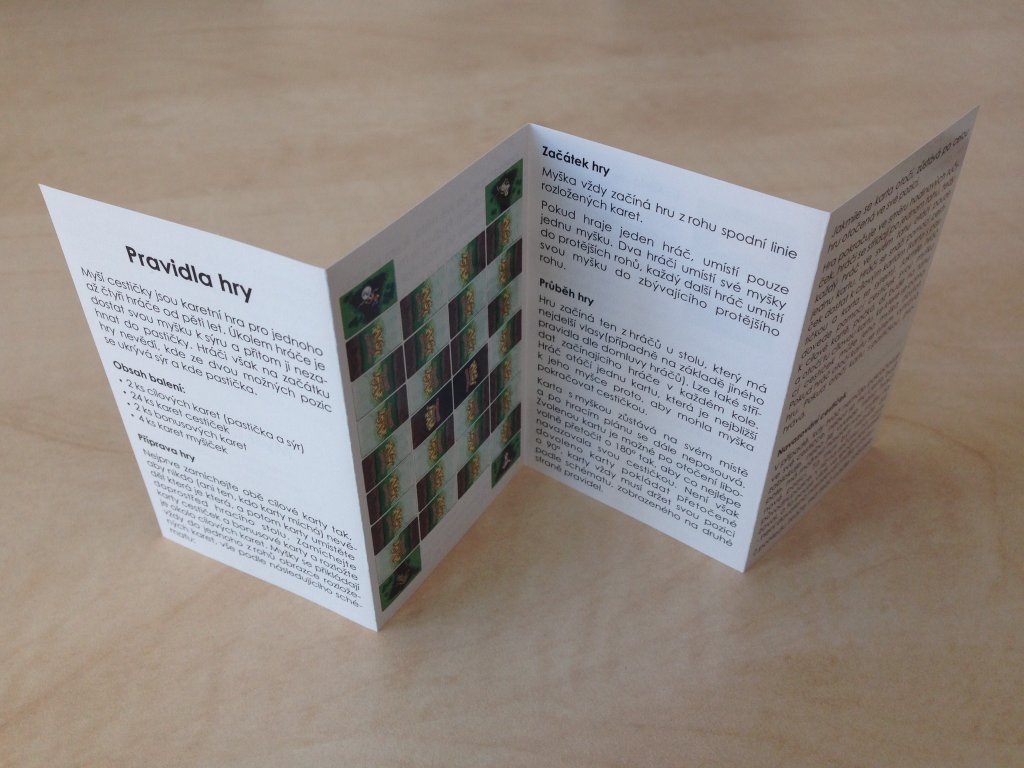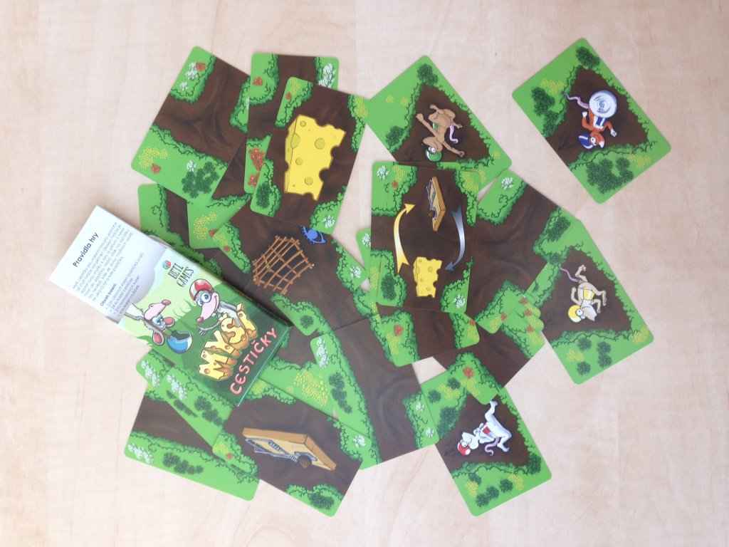 Hra obsahuje celkem 32 karet, z nichž je 24ks karet cestiček, 2 ks bonusových karet, 2 ks cílových karet a 4 ks karet myšek. Hra je balena v papírové krabičce, součástí balení jsou i pravidla hry.