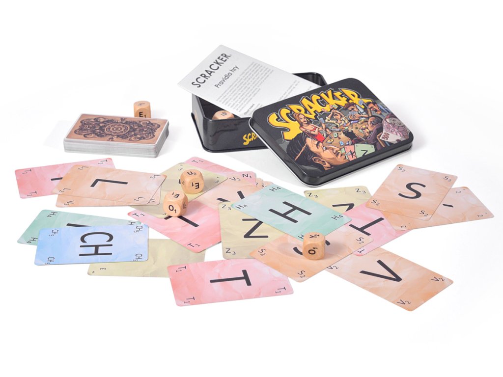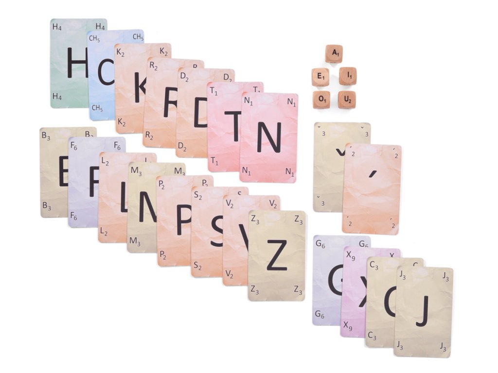 Hra obsahuje 65 karet a 5 kostek s písmeny. Na kartách jsou jednotlivé souhlásky, na kostkách samohlásky. Každé písmeno má svou bodovou hodnotu, která je odvozená od četnosti jeho výskytu ve slovech. Kromě písmen jsou na zvláštních kartách také diakritická znaménka (háček a čárka).